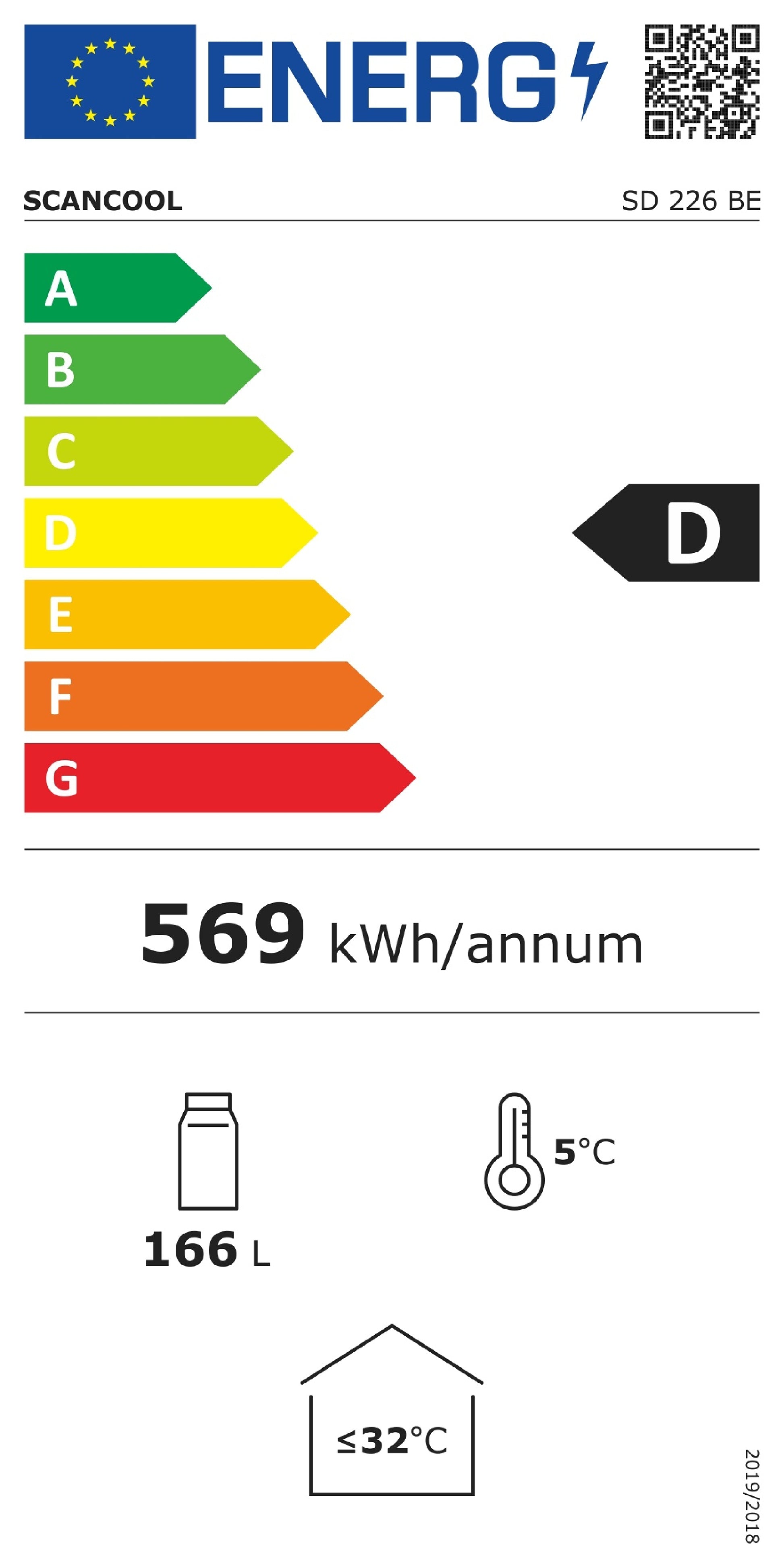 Display køleskab 166 liter sort - SD 226 BE Scandomestic Brand: Scancool Produktmål, HxBxD, mm 1892 x 390 x 475 Bruttovolume, ltr 166 5 justerbare