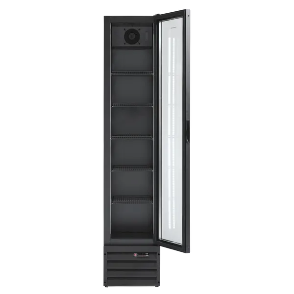 Leveres med 5 sorte, kraftige tråd hylder som sikrer at alle typer glas, dåser og flasker står stabilt på hylderne. Skabet har 4 justerbare fødder. Skabet har højre hængslet dør med lås som lukker automatisk hvilket altid minimerer temperaturstigninger.Belysning