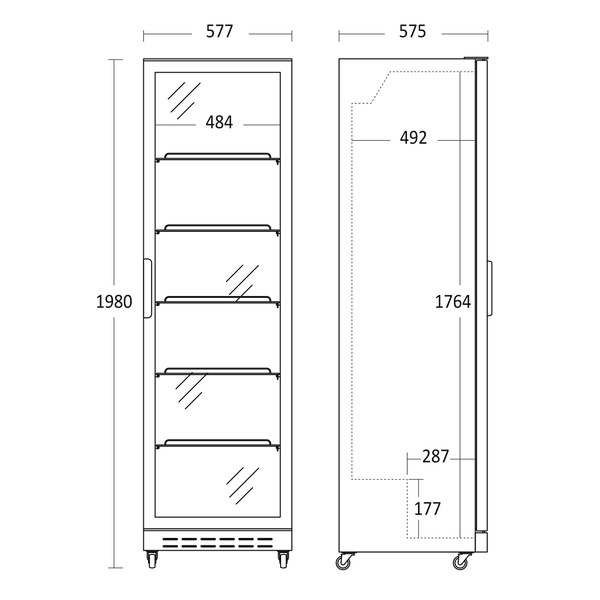 Leveres med 5 sorte, kraftige trådhylder med tråde som sikrer at alle typer glas, dåser og flasker står stabilt på hylderne. Skabet har 4 hjul + 2 støtteben, så det altid er muligt at flytte, også når det er fyldt op. Skabet har højre hængslet dør med lås, så det er muligt at aflåse skabet. Døren lukker automatisk hvilket altid minimerer temperaturstigninger.Belysning