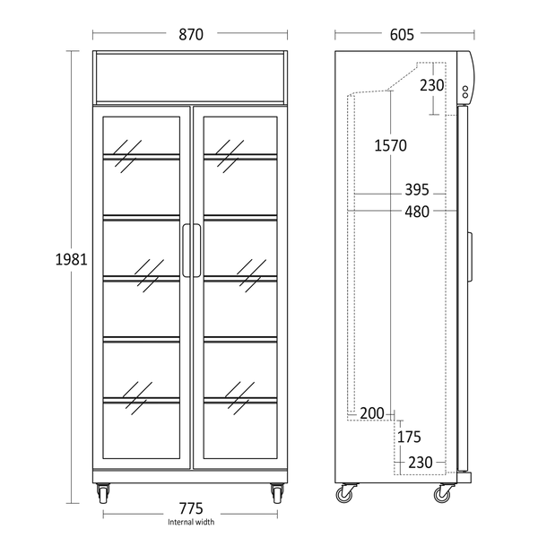 Display køleskab 579 liter - SD 881 BHE Scandomestic Brand: Scancool Produktmål, HxBxD, mm 1996 x 870 x 605 Bruttovolume, ltr 569 8 justerbare trådhylder