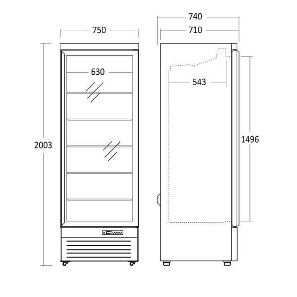 Display køleskab 614 liter sort - DC614BB Scandomestic DC614BB er et stort 1-dørs display køleskab, med 459 netto liter kølerum. Display køleren er både eminent