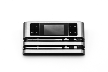 Det trådløse sæt fra Hâws BBQ indeholder to separate stegetermometre, hver med dobbeltsensor, så du kan måle både kernetemperatur (op til 100 °C) og omgivelsestemperatur (op til 300 °C) på én gang.