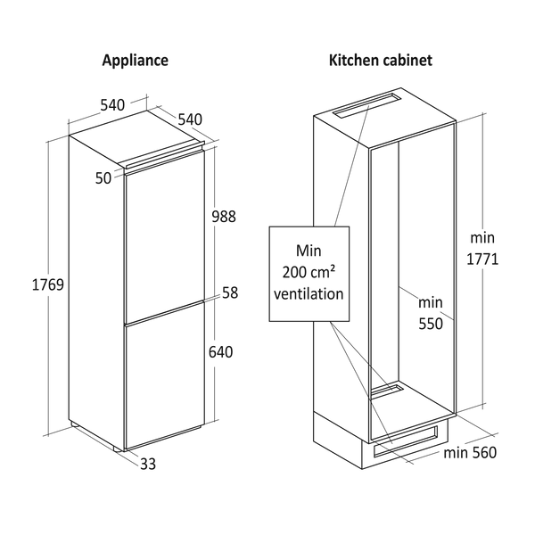- Indbygningsmål, HxBxD: 1771x560x550 mm