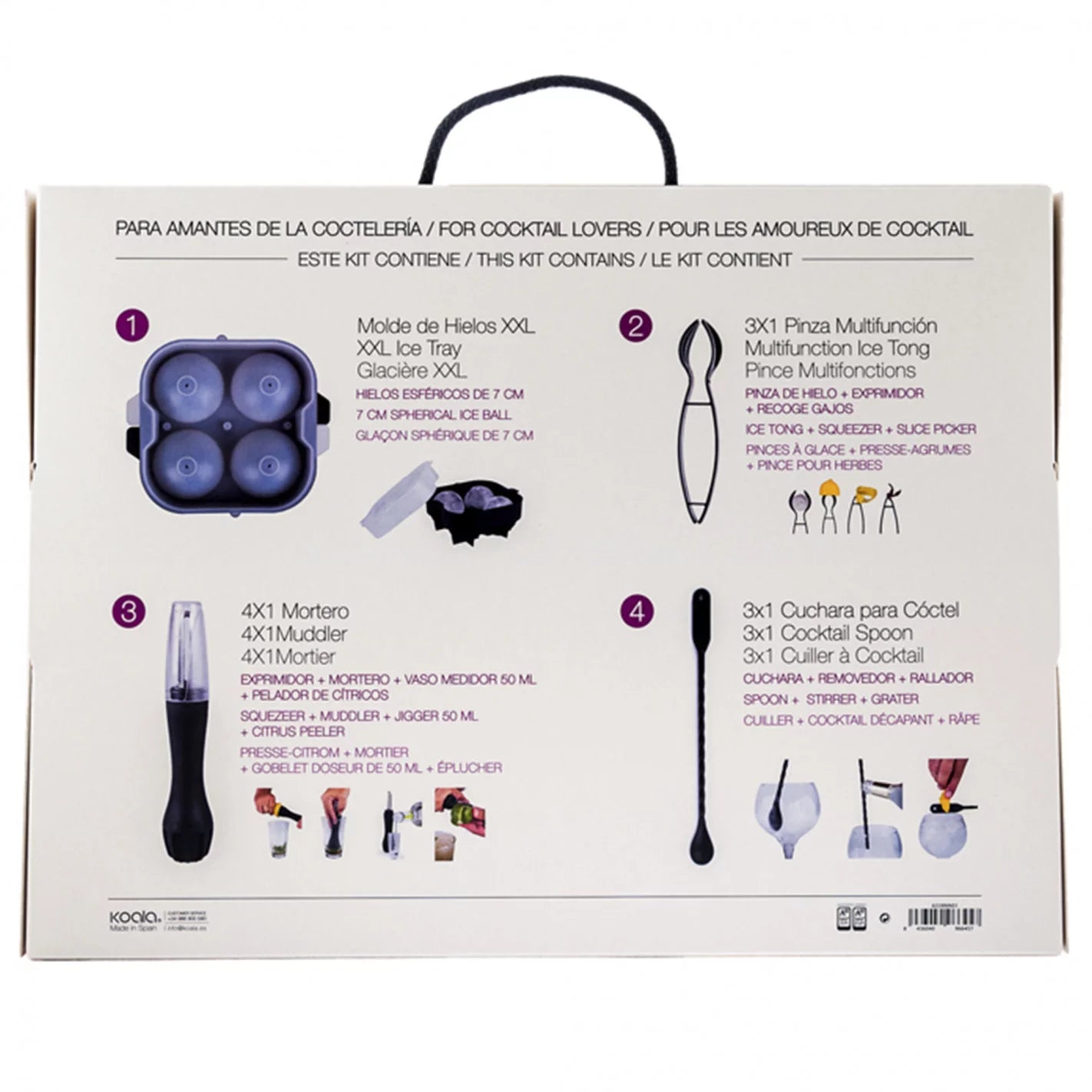 Cocktailsættet indeholder flere multifunktionelle redskaber, som giver dig mulighed for at lave den helt perfekte drink til dem du holder af. 3-i-1 tangen er perfekt til at gribe om XXL isboldene, når du skal have dem i glassene. Du kan også nemt få fat i en skive lime og placere den på glassets kant. 4-i-1 morteren og skrællekniven kan hjælpe dig, hvis du ønsker at pynte isboldene med bær eller fx mynte, inden du fryser dem ned. Skrællekniven kan bruges hvis du ønsker at snitte lidt citron, lime eller appelsinskræl af, som puttes i isformen. Over skrællekniven er der et målebæger, så du kan skænke drinks op med præcision. Den modsatte ende af skrællekniven er en morter, som du kan knuse fx urter med. Du kan også bruge den som citruspresser. 3-i-1 cocktailskeen har et snoet design, som hjælper dig med at ramme glasset, mens du hælder op. Skeen for enden kan hjælpe med at blande drinks. Den modsatte ende kan bruges som rivejern, hvis du ønsker citronskrællen fint revet.Sådan laver du en iskugle?