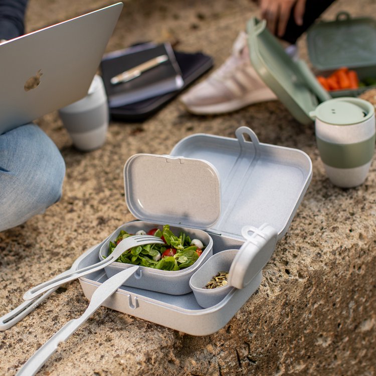 Hjemmelavet mad på farten har aldrig været lettere med hjælp fra vores nye organiske madkasser. At tage din egen sunde mad med dig, hjælper dig med at gøre din del i at bevare miljøet - det er endelig tid til at sige farvel til engangsemballage. Koziol Pascal madkasse er det intelligente system til god mad på farten. Systemet er gennemtænkt, og de tre kasser kan nemt indlejres i hinanden. Salat, indpakning, frugt, nødder, veggiepinde og krutoner kan adskilles pænt, så maden forbliver appetitvækkende, indtil den indtages. Det kompakte bestiks sæt, der finder sin plads i den store kasse, er den perfekte ledsager til madkassesættet. Takket være det modulære system kan din egen madkasse om- konfigureres hver dag og tilpasses til dagens opskrift.Fremstillet af genanvendeligt organisk materiale