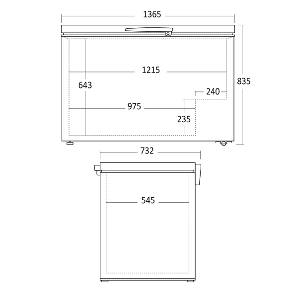 Hvid udvendig med håndtag i front og med fire hjul som gør den nem at flytte med. Når fryseren er lukket giver den også en ekstra og god arbejdsplads med det slidstærke vippelåg.Afrimning og rengøring