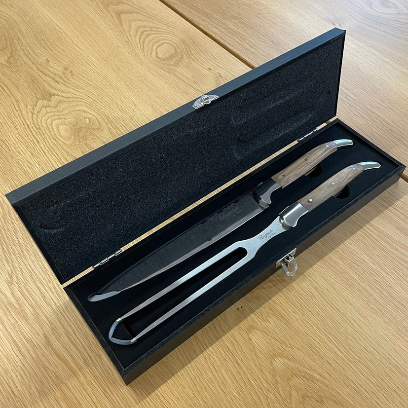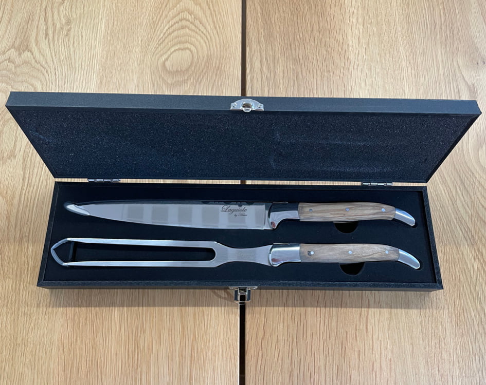 Laguiole forskærersæt i oliventræ Denne pakke indeholder udskærings kniv og stegegaffel fra det legendariske Laguiole design som er Fransk kvalitet og design når det er