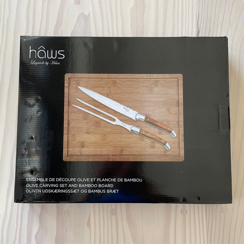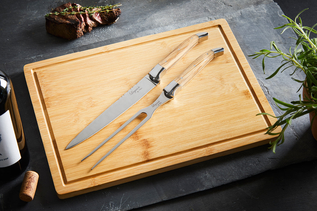 Laguiole forskærersæt med Bambus skærebræt Laguiole Forskærersæt: Lavet i Rustfrit stål med oliventræs håndtag. Bladet måler 19 cm (hele kniven 34 cm, stegegaflen 33 cm)