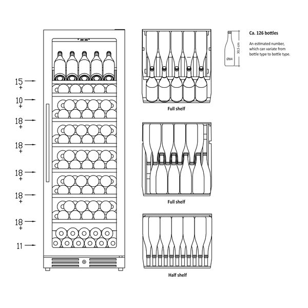 SV 111 B kan bruges til både indbygning og som fritstående vinskab og skabet har én zone. Skabet kan indstilles mellem 5°C – 18°C og kan rumme 126 flasker fordelt på 8 1/2 hylder i bøgetræ, heraf 7 1/2 udtrækshylder og 1 stationær. Et flot skab til opbevaring af dine flasker. Skabet har et tidløst design, hvor den sorte rammeløse glasdør og det indvendige lys giver skabet et eksklusivt udtryk. Højre hængslet dør med mulighed for dørvending, så det altid er fleksibelt at placere vinskabet i rummet. 1 horisontalt LED lys giver et godt lys og repræsenterer vinen flot. Skabet har intelligent luftcirkulationssystem, som sikrer perfekt ventileret, anti-vibrationskøling i hele skabet. SV 111 B har UV-beskyttelse, er elektronisk styret og har digitalt kontrolpanel, så det er nemt at se og justere temperaturen i skabet.Temperatur