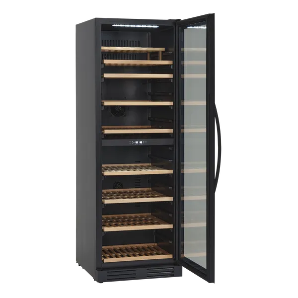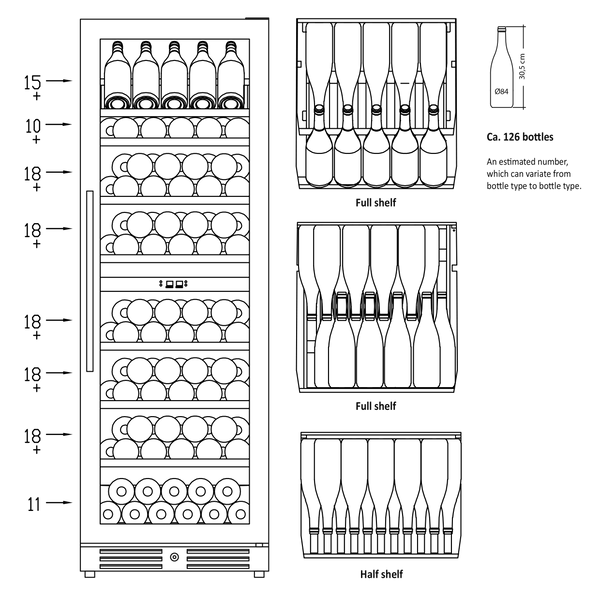 SV 124 B kan bruges til både indbygning og som fritstående vinskab. Skabet har to zoner, kan indstilles mellem 5°C – 18°C uafhængigt af hinanden. Skabet kan rumme 126 flasker fordelt på 7 1/2 hylder i bøgetræ, heraf 6 udtrækshylder og 1 1/2 stationær. Et flot skab til opbevaring af dine flasker. Skabet har et tidløst design, hvor den sorte rammeløse glasdør og det indvendige lys giver skabet et eksklusivt udtryk. Højre hængslet dør med mulighed for dørvending, så det altid er fleksibelt at placere vinskabet i rummet. 2 horisontale LED lys giver et godt lys og repræsenterer vinen flot. Skabet har intelligent luftcirkulationssystem, som sikrer perfekt ventileret, anti-vibrationskøling i hele skabet. SV 124 B har UV-beskyttelse, er elektronisk styret og har digitalt kontrolpanel, så det er nemt at se og justere temperaturen i skabet.Temperatur:
