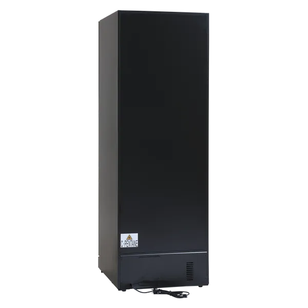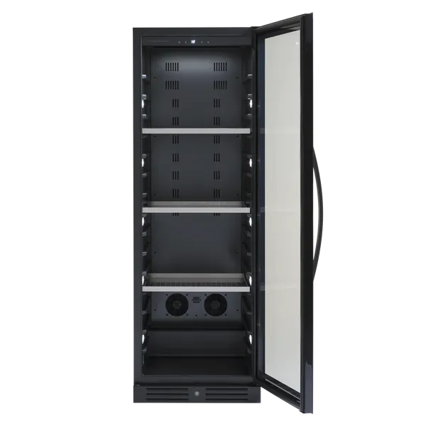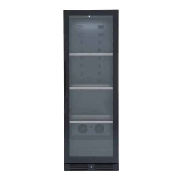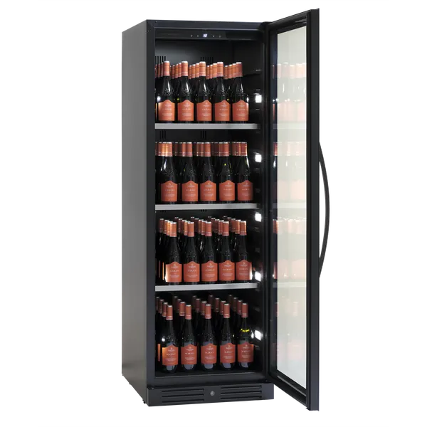 Sort serveringsskab med eksklusiv, rammeløs glasdør med lås. Leveres med 3 kraftige stålhylder til 138 opretstående flasker. Højre hængslet dør med mulighed for dørvending, så det altid er fleksibelt at placere vinskabet i rummet. Skabet har lås, så det også er muligt at aflåse.Belysning