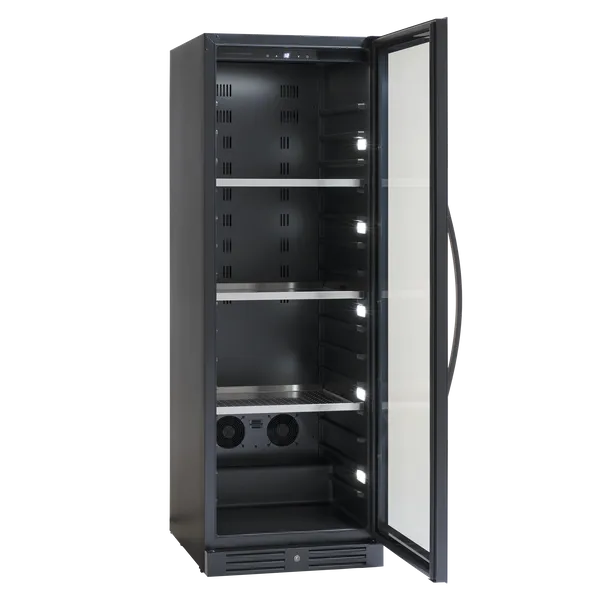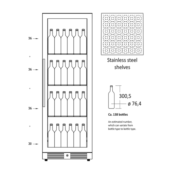 SV 138 B kan bruges til både indbygning og som fritstående serveringsskab. Skabet har én zone, kan indstilles mellem 5°C – 18°C og kan rumme 138 stående flasker fordelt på 3 stålhylder. Et flot skab til at vise dine flasker frem. Designet er tidløst og med intuitivt touch display, der sammen med det indvendige lys giver skabet et eksklusivt udtryk. Højre hængslet dør med mulighed for dørvending, så det altid er fleksibelt at placere vinskabet i rummet. Skabet har lås, så det også er muligt at aflåse. 10 LED lys i siderne og 1 LED lys i top giver et godt lys og repræsenterer vinen flot. Skabet har intelligent luftcirkulationssystem, som sikrer perfekt ventileret, anti-vibrationskøling i hele skabet. SV 138 B er elektronisk styret og har digitalt kontrolpanel, så det er nemt at se og justere temperaturen i skabet.Interiør og kabinet